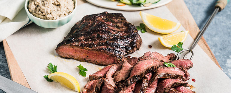 Snijd het vlees in dunne plakjes over het graan. Serveer het met de komkommersalade, Baba Anousch en extra tahindressing. Eetsmakelijk!